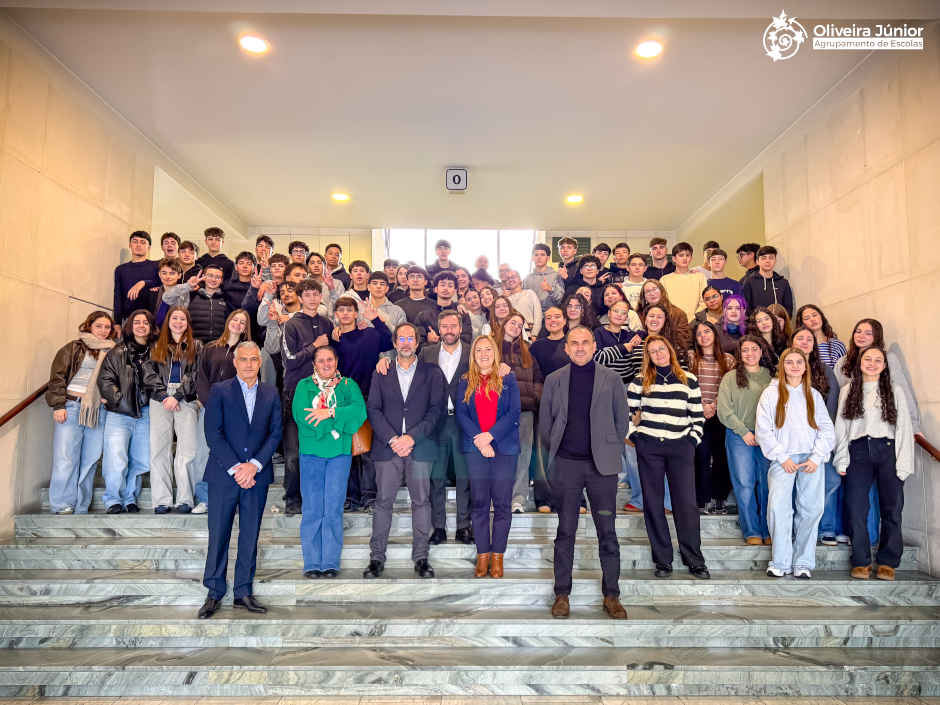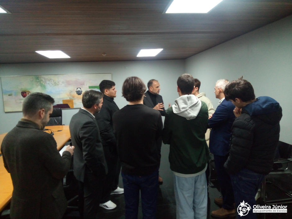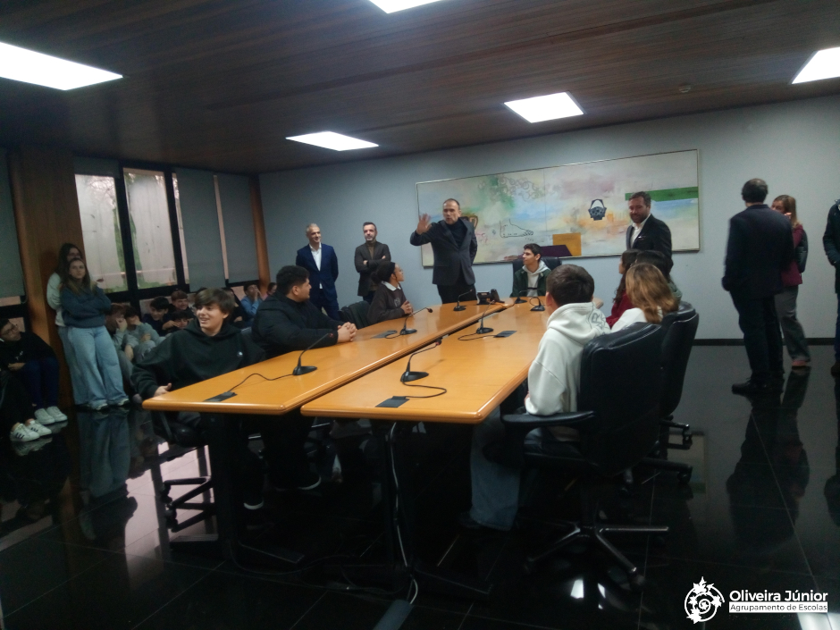 Os alunos do 10.º ano visitaram a Câmara Municipal de São João da Madeira numa atividade integrada na Educação para a Cidadania e na disciplina de Filosofia. Recebidos pelo Presidente João Oliveira e pelo Executivo, conheceram o funcionamento do órgão executivo e das diferentes divisões municipais, compreendendo o papel da autarquia na gestão de áreas como urbanismo, cultura, educação, ambiente, ação social e desenvolvimento económico. A experiência permitiu perceber a importância das instituições democráticas locais e da participação cívica, reforçando a ligação entre os conteúdos curriculares e a formação de cidadãos conscientes e responsáveis.