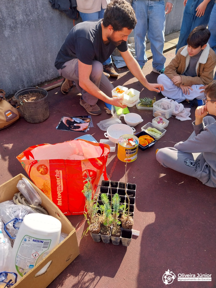 compostagem promovido pela Associação ZERO, transformando o recreio num espaço de aprendizagem ativa sobre economia circular. A iniciativa, integrada no projeto de sensibilização ambiental da escola, ensinou alunos, professores e assistentes operacionais a converter resíduos orgânicos em fertilizante para a horta escolar.
